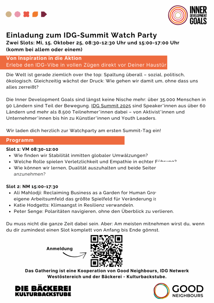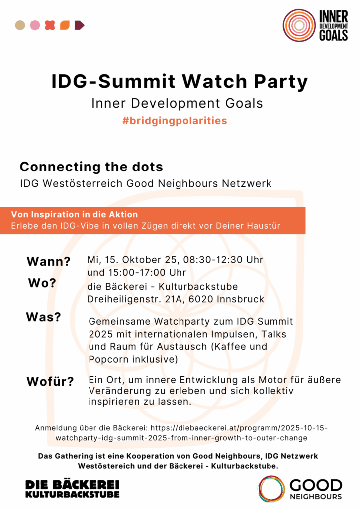 Aus diesem Grund haben wir den IDG-Hub Westösterreich mit Sitz in Innsbruck gegründet und befinden uns derzeit im Aufbau. Wenn du den Ruf verspürst und gemeinsam mit uns diesen Weg gehen möchtest, bist du herzlich eingeladen, dich bei uns zu melden. Neben Co-Creation und Wissensaustausch erwarten dich regelmäßige Hub-Treffen, um gemeinsam an dieser wichtigen inneren Transformation zu arbeiten und neue Wege zu gehen.