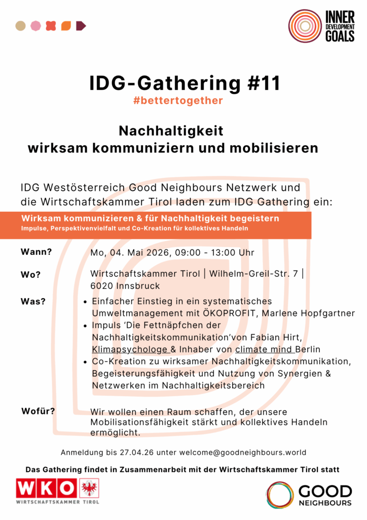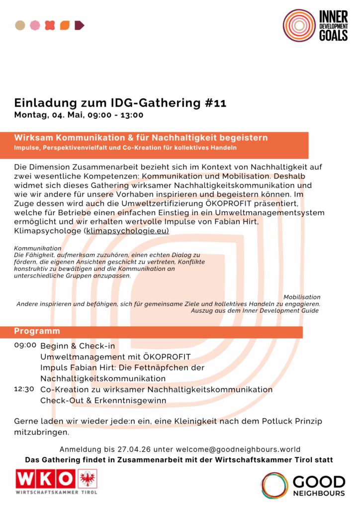 Aus diesem Grund haben wir den IDG-Hub Westösterreich mit Sitz in Innsbruck gegründet und befinden uns derzeit im Aufbau. Wenn du den Ruf verspürst und gemeinsam mit uns diesen Weg gehen möchtest, bist du herzlich eingeladen, dich bei uns zu melden. Neben Co-Creation und Wissensaustausch erwarten dich regelmäßige Hub-Treffen, um gemeinsam an dieser wichtigen inneren Transformation zu arbeiten und neue Wege zu gehen.